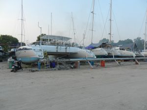 Dulcinea's mast lies across several boats in the yard in Chalong Feb 2012 N7 50 E98 22