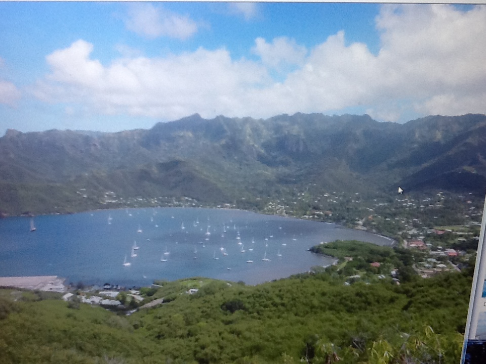 It was a long journey involving 4 flights from Calgary to the little volcanic island of Nuku Hiva in the Marquesas. When we arrived, we were both hot, and David was stiff enough to have a sore back for several days. Kevin, an American who has set up home in Nkuk Hiva met us at the airport. He had been visiting Dulcinea each week, and she was anchored safely and securely when we arrived. We like Kevin.